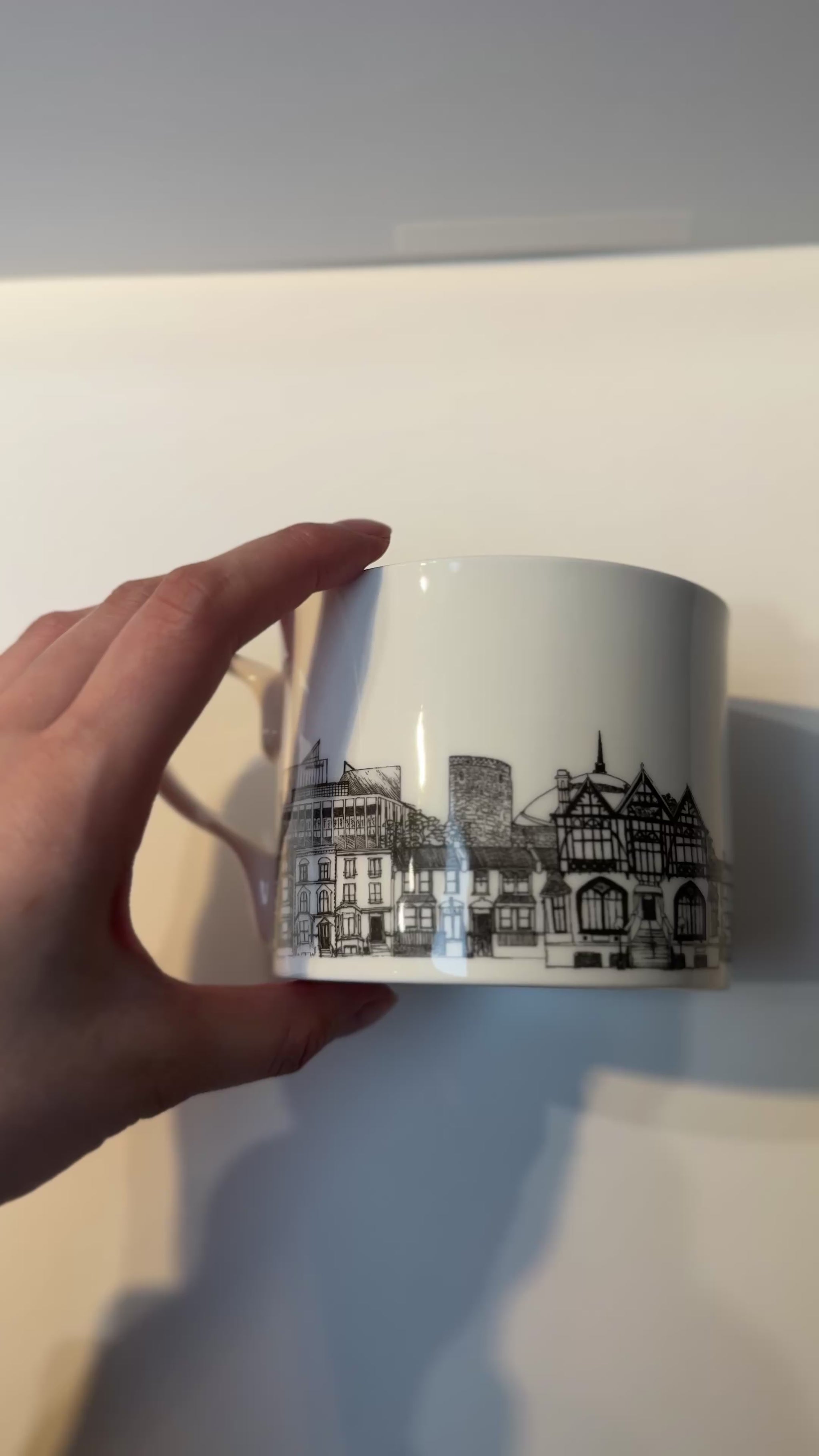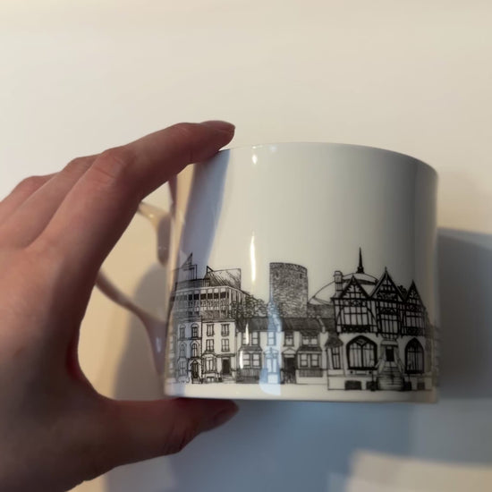 A charming illustrated mug featuring iconic Canterbury architecture in delicate black linework. A lovely gift or keepsake.