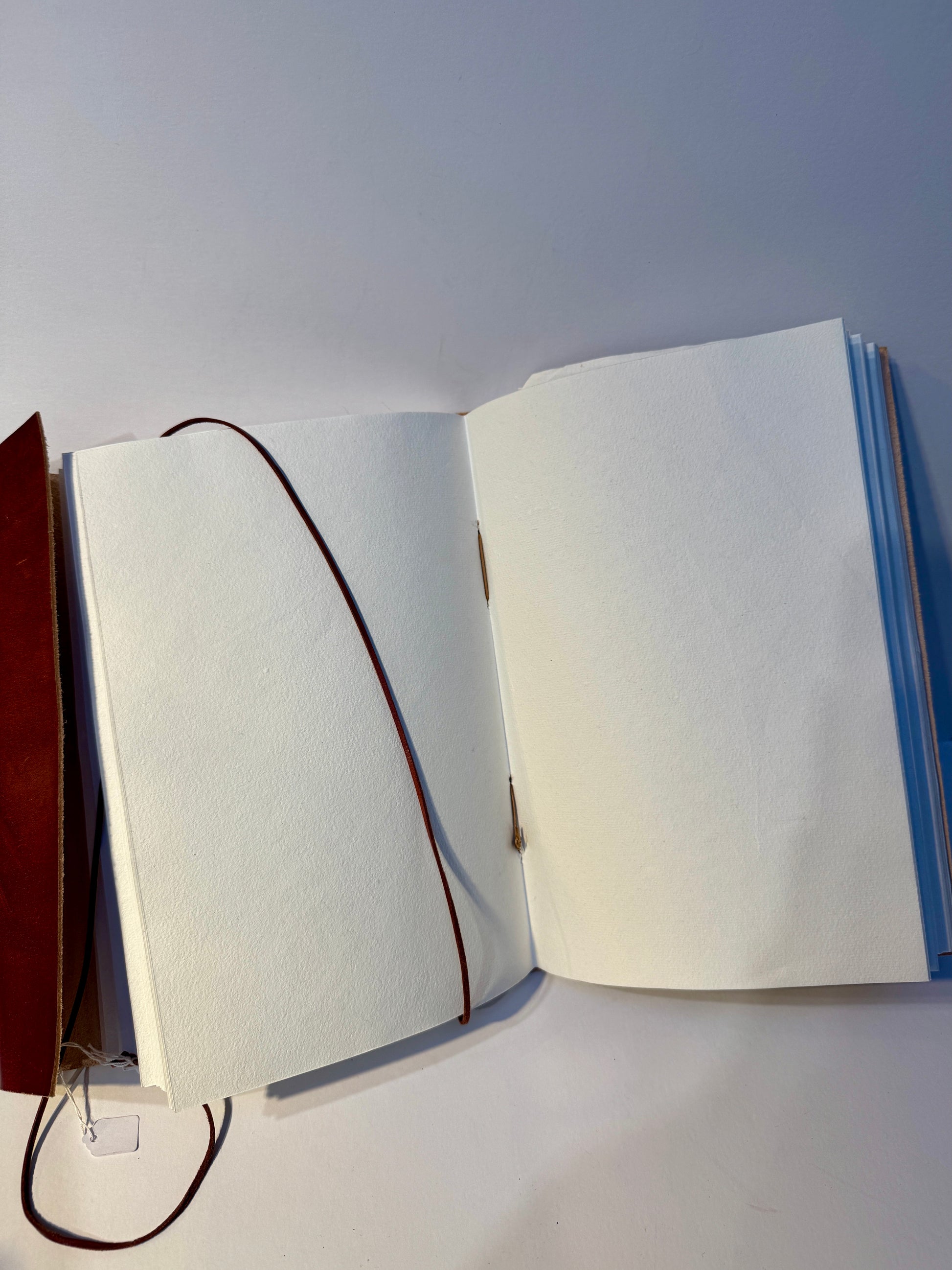 Each journal is hand-stitched along the spine with a rustic cross-lacing design and finished with a soft leather wrap tie for secure closure.